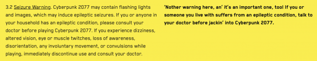 The company then pointed users to its End User License Agreement, where under Section 3.2 it has placed a ‘seizure warning’ that indicates “Cyberpunk 2077 may contain flashing lights and images,” and suggests users with an epileptic condition consult their doctor before playing. The full warning can be read below.